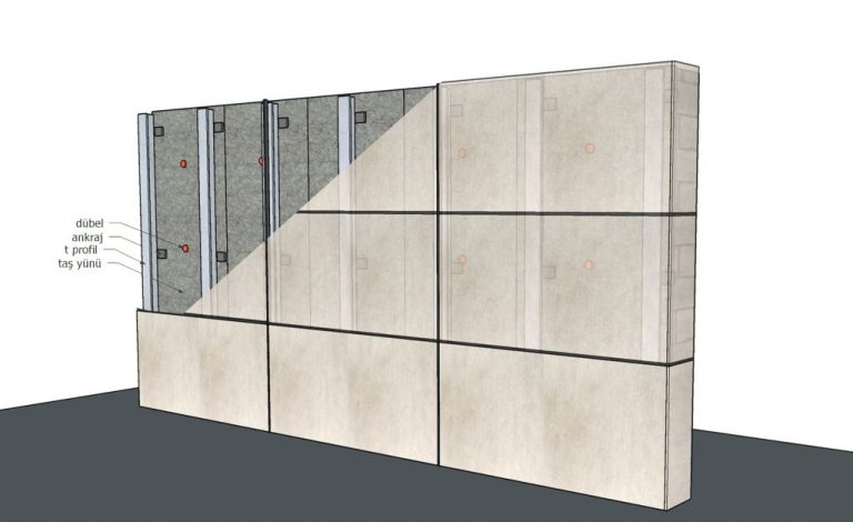 Bu sistem de taşıyıcı L konsollar betonarme duvara çelik gömlekli dübel ile terazisinde sabitlenir. Duvara sabitlenen L konsollar üzerine taşyünü ve su yalıtım malzemesi uygulanır. Daha sonra T profiller L konsol üzerine vidalanıp seramikler çelik silikon ile profillere yapıştırılır.